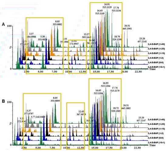 Representative ultra-high-performance liquid chromatography quadrupole time-of-flight mass spectrometry (UHPLC–qTOF–MS) base peak intensity (BPI) chromatograms showing the separation of specialised metabolites in methanol extracts of callus cultures derived from Bidens pilosa leaves (A) and stems (B) maintained on different ratios of 2,4-dichlorophenoxyacetic acid (2,4-D) to benzyl aminopurine (BAP) ((1:10), (10:1), (0:0), (1:2), (1:20) and (1:40)) as detailed in Table 1. Hydroxycinnamic acid derivatives were found to be a prominent group of metabolites in these cultures, albeit with differential peak intensities.