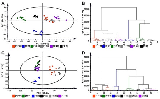 Unsupervised multivariate statistical analysis was employed to explore datasets generated by the UHPLC–qTOF–MS analysis of methanol extracts of B. pilosa stem- and leaf callus maintained on media with different ratios of 2,4-D to BAP ((1:10), (10:1), (0:0), (1:2), (1:20) and (1:40)). To analyse the variability within and between the datasets, PCA scores scatterplot models were constructed for leaf callus (Figure 3A) and stem callus (Figure 3C), which reduced the dimensionality of the datasets [38,39,40]. The PCA scores scatterplot (Figure 3A) computed for extracts from leaf callus was an 11-component model of which PC1 and PC2 explained 30.6 and 14.5% of the variation within the dataset. Visually, the PCA scores scatterplot indicated differential metabolic profiles within the datasets, as condition-specific clustering was observed. Leaf callus maintained on media with higher cytokinin ((1:10), (1:20) and (1:40) 2,4-D to BAP) were found to be more closely related. The statistical validation of the model was described by the explained variation/goodness of fit R2 = 0.876 and the predictive variance Q2 = 0.704. The statistical validation performed indicated that the model computed was fit, as acceptable models for biological data are described by R2 > 0.7 and Q2 > 0.4 [41].