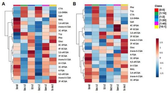 Heatmaps illustrating the occurrence/ distribution of metabolites identified in B. pilosa leaf callus (A) and stem callus (B), maintained on media with different ratios of 2,4-D to BAP ((1:10), (10:1), (0:0), (1:2), (1:20) and (1:40) as detailed in Table 1). Group averages were used to simplify the visualisation of the distribution of these HCA derivatives. Abbreviations of metabolites are as defined in Table 1.