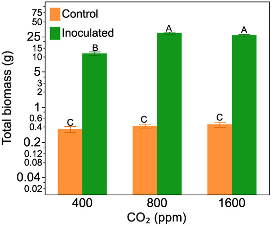 The effect of CO2 level on Alnus incana ssp. rugosa total biomass with and without nitrogen-fixing nodules. Bars are means with standard errors and averaged across non-herbivore and herbivore treatments. Bars with the same letters are not significantly different according to Tukey’s HSD Test.