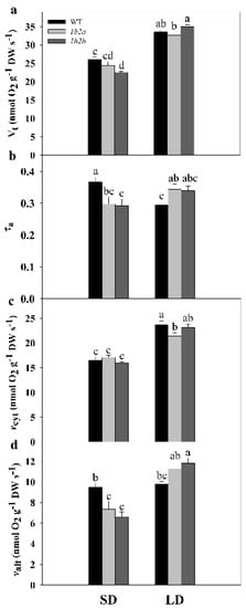 Measurements of oxygen consumption and isotope discrimination during respiration were performed at 25 °C as previously described in order to determine the in vivo activities of the COX and AOX pathways in Arabidopsis leaves [62]. As for the end-point discrimination values, the oxygen isotope discrimination of the AOX pathway was determined after incubation with 10 mM KCN as described previously [62], and a mean value of 30.5‰ was used from all the measurements performed both in the mutant and wild-type plants because no differences were observed between lines. On the other hand, an end-point value of 20.9% corresponding to the oxygen isotope discrimination of the COX pathway was taken from previous measurements in Arabidopsis leaves [62]. Calculations of the electron partitioning and the activities of the AOX and COX pathways were performed as described previously [74]. As a preliminary experiment, Vt and τa were determined at three different daytime periods to test their variation along the daytime. For this preliminary analysis, we pooled data of the two mutant lines and evaluated whether values of Vt and τa in WT and cytc mutants corresponding to the second and third daytime periods differed from the first daytime period in each photoperiod condition (SD and LD) (Figure S2). Values are means ± SE for three to four and four to eight biological replicates for WT and cytc mutants, respectively, at each daytime period and photoperiod. For the experiments presented in Figure 2, six to nine replicates (each representing pools of leaves from at least two different plants) per line and photoperiod were performed for in vivo activities.