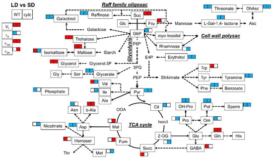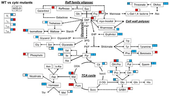 Metabolic model showing comparisons of leaf primary metabolites and respiratory parameters between WT and cytc mutants under SD and LD. Colored metabolites are those showing to be significantly (p < 0.05) higher (red) or lower (blue), determined by Duncan’s test. For cytc mutants, highlighted metabolites are those displaying consistent changes in both mutant lines as compared with WT in each photoperiod. Data used were taken from Figure 2 and Table 2. See Figure 3 for the abbreviations. * Only one line significantly (p < 0.05) different from WT but the other line with the same trend and intermediate response.