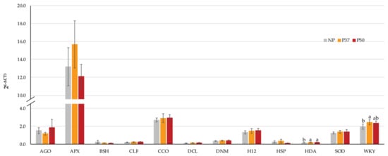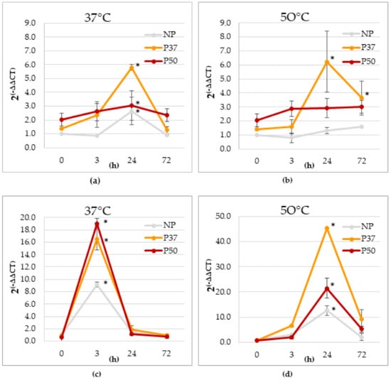 Heat pulses at 37 °C (Figure 2a) or 50 °C (Figure 2b) for 3 h increased significantly the expression of the WKY gene in P37 plants at the end of the stress, but picked (about 6-fold) 24 h after the end of the pulse. Irrespective of the heat pulse (37 or 50 °C), no significant variation was found along with time in the expression of this gene in P50 plants. Expression of HSP significantly increased when plants were incubated at 37 °C for 3 h, particularly in primed plants (P37 and P50) and by the end of the heat pulse (Figure 2c). Basal level of HSP expression was recovered after 72 h. When the heat pulse was 50 °C for 3 h (Figure 2d), HSP expression also increased, being this increment especially notorious in P37 plants. The highest increase relative to the basal expression level of NP plants (up to 40-fold) was observed 24 h after the end of the treatment.