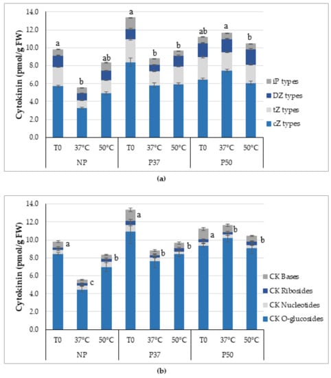 In arabidopsis, heat stress is associated with alterations in the endogenous levels of CKs and ABA, both seems to be involved in HSP regulation [56]. Particularly, these authors reported that upon exposure to heat stress, ABA content decreased transiently, but levels of active CKs increased in leaves. These changes are associated with the stimulation of transpiration that might help plants to cool down leaf temperature. In our experiments, basal (T0) content of CKs, was higher in P37 than in P50 plants, being always lower in NP (Figure 3a,b). In contrast, the concentration of CK bases in radiata pine was lower in EMs produced after priming at 40 °C in relation to their controls at 23 °C [35]. These differences could be due to the material analyzed, EMs in radiata pine growing in the dark and needles in maritime pine.