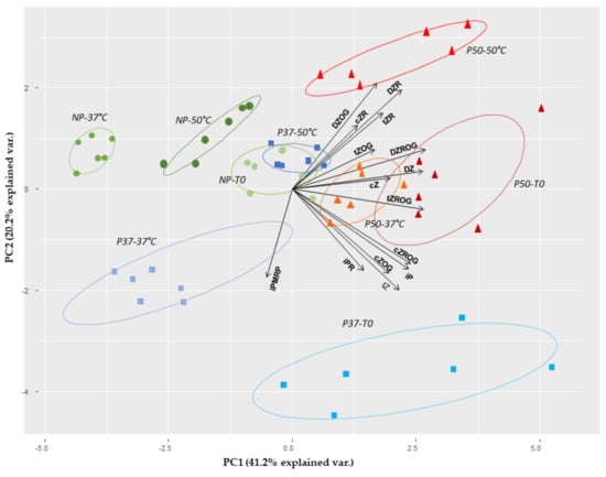 Principal component analysis of 15 cytokinins contents in maritime pine plants derived from control (NP) or primed megagametophytes (P37 and P50), before (T0) and after 3 h of heat stress treatment at 37 °C or 50 °C. Legend: iP, isopentenyladenine; tZ, trans-zeatin; DZ, dihydrozeatin; iPR, isopentenyladenosine; tZR, trans-zeatin riboside; DZR, dihydrozeatin riboside; iPRMP, isopentenyladenosine-5′monophosphate; tZOG, trans-zeatin-O-glucoside; DZOG, dihydrozeatin-O-glucoside; tZROG, trans-zeatin riboside-O-glucoside; DZROG, dihydrozeatin riboside-O-glucoside; cZ, cis-zeatin; cZR, cis-zeatin riboside; cZOG, cis-zeatin-O-glucoside; cZRG, cis-zeatin riboside-O-glucoside.