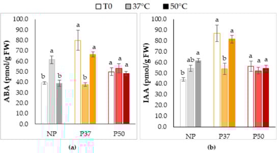 In these in vitro growing maritime pine plants subjected to 3 h heat pulses, we also analyzed ABA and IAA contents, before and after the stress treatment. On average, P37 plants showed higher ABA (Figure 5a) and IAA (Figure 5b) contents than NP and P50 plants (p = 0.004 and p = 0.005, respectively), but initial hormone contents of these plants decreased after a heat pulse at 37 °C (p = 0.005 and p = 0.024, respectively), while this treatment significantly (p = 0.001) increased ABA level in NP plants. Similarly, IAA content of NP plants significantly increased (Figure 5b) after a heat treatment at 50 °C (p = 0.041). In contrast, ABA and IAA contents of P50 plants remained unaffected after either a 37 °C or 50 °C heat treatment.
