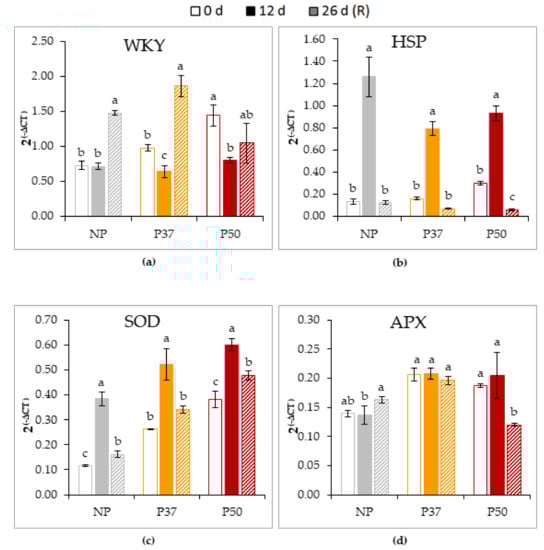 Expression level of WKY (a), HSP (b), SOD (c) and APX (d) genes in needles of 2-year-old maritime pine plants derived by somatic embryogenesis from not primed (NP) or primed at 37 °C (P37) or at 50 °C (P50) megagametophytes, when subjected to a 12-d heat stress treatment, and allowed to recovery for further 14 d. HIS was used as reference gene. Data are mean ± SE of 3 replicates. For each type of sample, values followed by the same letter were not significantly different according to Tukey test.