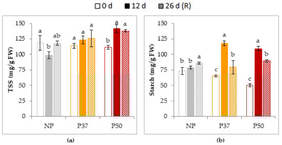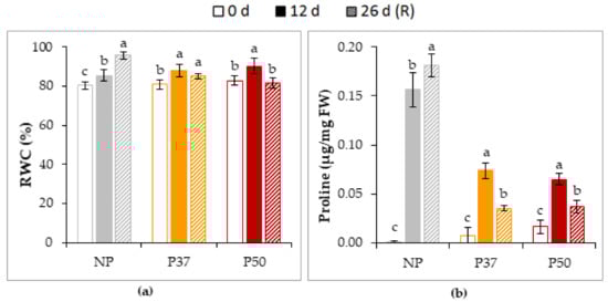 Regarding the starch content, we found significant differences among NP, P37 and P50 plants before the heat stress (Figure 10b). However, and despite such differences, after the heat treatment (12 d) primed plants increased significantly their starch content, while this parameter did not change in NP plants. In radiata pine, Escandón et al. [18] did not find differences in starch content between stressed and non-stressed plants. Wang et al. [73] reported that acclimatization of wheat plants to high temperatures effectively improved carbohydrate mobilization and increased starch granules size when plants were subjected to heat stress. Furthermore, starch content variation depended on the type of abiotic stress [76].