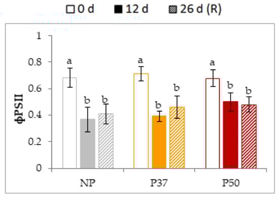 Before the heat treatment (0 d), the Fv/Fm (ΦPSII) yield was about 0.7 with no significant differences among NP, P37 and P50 plants. Heat stress treatment (12 d) decreased photosynthetic yield in all groups of plants (Figure 8) being the P50 (−26%) less affected than NP (−46%) and P37 (−45%) plants. These ΦPSII yields did not significantly increased after the recovery period.