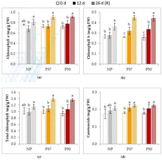 Pigments contents were also analyzed, including chlorophyll a, chlorophyll b, total chlorophyll and carotenoids. Basal contents (0 d) were similar in control and primed plants for the four parameters, and after heat stress remained unaffected chlorophyll a (Figure 9a) and total chlorophyll (Figure 9c) contents, while significantly increased chlorophyll b (Figure 9b) and carotenoids (Figure 9d) contents in primed plants. Mean increase in chlorophyll b for P37 and P50 plants was 27%, and carotenoids increased 15% on average, in contrast to NP plants, which did not show significant variation for these parameters. After the recovery period, chlorophyll a, chlorophyll b and total chlorophylls contents increased significantly (on average 20%, 33% and 23%, respectively) in the three groups of plants, while carotenoids contents did not change, although in NP plants the observed values were significantly higher than those determined after 12 d of heat stress (Figure 9d)
