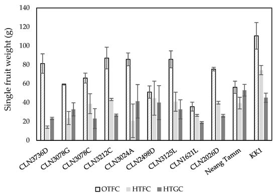 Compared to OTFC, the single fruit weight (SFW) decreased significantly under high temperatures of both field and greenhouse conditions (Figure 1). Under OTFC, local genotype KK1 had the highest SFW while genotype CLN1621L was the lowest SFW. The differences of SFW between the two high temperature conditions were not consistent. Under HTFC condition, local genotype KK1 had highest SFW, while the lowest was observed for genotype CLN3736D. The SFW of both local genotypes tended to be higher. The SFW of genotype Neang Tamm was significantly higher than genotypes CLN3736D, CLN3078C, and CLN1621L.