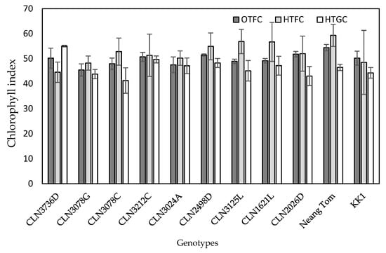 Chlorophyll index readings are positively correlated with leaf chlorophyll content [25,26,27]. High temperature adversely affects chlorophyll content, photosynthesis rate, and consequently plant biomass production [28]. In the present study, a decrease in chlorophyll index of most genotypes was observed for HTGC compared to OTFC (Figure 3). It could be due to the fact that very high temperature under greenhouse condition may lead to stomata closure; therefore, lower photosynthetic rate [28]. This resulted in greater dried biomass under OTFC and HTFC than under HTGC (Table 3). This was exception for genotype CLN3736D which had high chlorophyll index under HTGC. The mechanisms associated to greater chlorophyll index under HTGC for this genotype needs further investigation. This could be associated with the rate of chlorophyll breakdown or degradation which changes with leaf senescence and during fruit ripening in tomato [29]. A recent study on tomato observed that chlorophyll index was greater under heat stress [30]. The impact of heat stress on chlorophyll content of tomato can vary with genotypes, temperature, and stage of development and their interactions [12].
