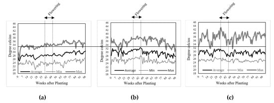Temperature data loggers (HOBO UX100-003; Onset Computer Corporation, Bourne, MA, USA) were installed to record temperatures at 15 min intervals throughout the three growing conditions. The HTFC research was conducted during the dry season (March to June, 2018), where crops are often exposed to high temperatures. The HTGC research was conducted during the rainy season (July to October, 2018); however, the crop was exposed to high temperatures by not installing a micro-climate controlling system. The OTFC research was carried out during optimal temperature condition (December 2018 to March 2019). The weather in Cambodia starts to cool down in November. The temperatures normally start to rise by March. Thus, the growing condition of OTFC experiment was considered as an optimum condition (Figure 4). Temperature ranged from 23.47 °C to 38.84 °C in HTFC with a mean temperature of 29.87 °C, from 23.62 °C to 42.98 °C in HTGC with the mean temperature of 29.43 °C, and from 20.13 °C to 37.65 °C with the mean temperature of 28.08 °C in OTFC (Figure 4).