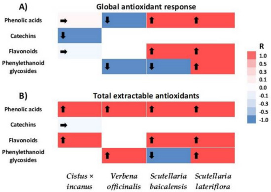 Heat map of correlation between phenolic acids, catechins, flavonoids, and phenylethanoid glycosides and antioxidant potential in biomasses cultured in vitro and in soil-grown plant raw materials of Cistus × incanus, Verbena officinalis, and Scutellaria baicalensis, and Scutellaria lateriflora. Global antioxidant response panel (A), and total extractable antioxidants panel (B). Color saturation represents the intensity, whereas arrows represent the direction of correlation coefficient value (R) change.