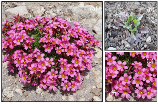 (a) A typical loose cushion of Oxalis squamata on Site III. Captured on 12 Jan 2016 by M.T.K.A. (b) Plant greening up on Site I. Captured on 20 August 2019 by M.T.K.A. (c) Details of flowers.