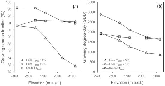 Under the hypothetical scenario of a progressive elevational reduction in TBASE, GS and GDDGS showed less elevational variation (Figure 2a,b). The fraction of snow-free days across sites for which growth would have been possible was consistently over 90%. Overall, these results confirm the snow-free period and the biological GS on the Andean location is long. They also show that sizable elevational differences in the opportunity for growth will exist when a plant species’ lower temperature limit for growth remains invariant with elevation, potentially impacting flowering times.