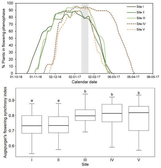 (a). Smoothed curves for the percentage of plants in the flowering phenophase over the day intervals (see Materials and Methods section for more details). The grey shading indicates the historically regionally-warmest half month of the summer season. See Figure A1 for more details. Flowering (FF) commenced on 21 Oct on Site I, 2 Nov on Sites II and III, 17 Nov on Site IV, and 25 Nov on Site V. Peak flowering (FLP) occurred on 14 Dec on Site I, 2 Jan on Sites II and III, 5 Jan on Site IV, and 14 Jan on Site V. (b). Degree of overlap (flowering synchrony) in the flowering periods of individual plants on each site according to the Augspurger flowering synchrony index. Different letters indicate significant differences according to the Dunn test at p < 0.05.