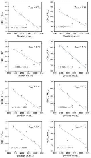 Regressions of GDD_FLP, GDD_FF50%, GDD_FFPOP, and GDD_FLPPOP for fixed TBASE = 5 °C and fixed TBASE = 1 °C on elevation. See Table 2 for significance of regressions.