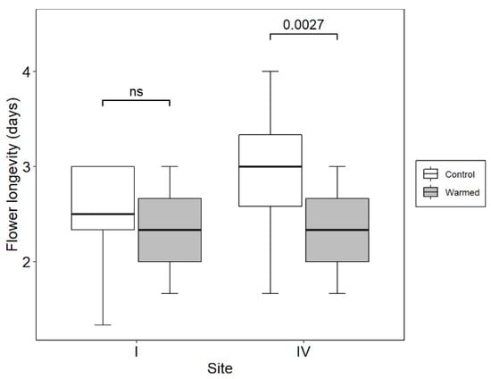 Effect of experimental warming on flower longevity in O. squamata on a subalpine (Site I) and a high alpine site (Site IV). The two sites are separated by 635 m elevation. The numbers above the brackets give the p-value according to Mann–Whitney U-test. n.s = not significant at p = 0.05. The open top chambers (OTCs) used to warm flowers of O. squamata increased temperature around the flowers by 3.9 °C (Site I) and 3.6 °C (Site IV) over the controls.