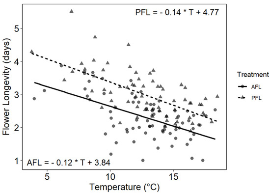 Linear regressions of flower longevity on temperature. Temperatures are for the same days the flowers in a batch remained opened. Individual points correspond to the mean flower longevity of each flower batch. Temperature was a significant predictor of both PFL and AFL (PFL: F1,71 = 32.211, p = 2.900 E-07; AFL: F1,71 = 46.272, p = 2.857 E-09).