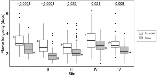 Flower longevity in pollinator-excluded (PFL) and pollinator-exposed (AFL) flowers of O. squamata on the five sites ordered from lower to higher elevation. See Table 1 for elevations of sites. Lower case letters alongside the PFL and upper-case letters alongside AFL boxes show significant differences between sites according to the Dunn test following analysis with the Kruskall–Wallis test (PFL: X2 = 52.375, p = 1.152e-10; AFL: X2 = 100.81, p < 2.2e-16). The numbers above the brackets are the P values for differences between AFL and PFL on each site according to the Dunn test.