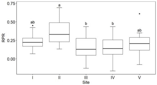 Comparison of the RPR index for O. squamata on the five alpine sites. Sites are ordered from the lowest to the highest-elevation site. See Table 1 for elevations of sites. Higher values of this index indicate faster pollination than lower values. Different lower-case letters indicate significant differences between sites based on the Tukey test following One-Way Anova (F1,4 = 3.989, p = 0.00581).