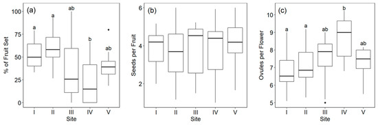 (a) Percent fruit set, (b) seed number per fruit, and (c) number of ovules per flower in open-pollinated plants of O. squamata on the five sites ordered from lower to higher elevation. See Table 1 for elevations of sites. Different letters indicate significant differences according to the Tukey a posterior test for the variables where a significant effect of site was found. Site had no significant effect on seed per fruit.