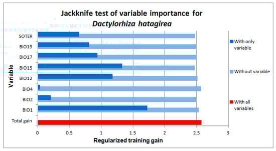 Results of the jackknife test of the importance of the environmental variables to be used in the development of the Maxent model of Dactylorhiza hatagirea. The length of the dark-blue bar indicates the size of the impact of the selected variable, and the length of light-blue bar shows how much of the explanatory power of the model would be lost if the corresponding factor were excluded from the analysis. See Table 1 for full names of the variables on the y-axis.