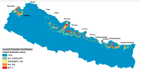 Predicted current potential distribution of habitats of different suitability in Nepal based on current climatic conditions. The values 0.2–0.335 (grey colour) indicate low suitability (below the lowest presence threshold), 0.335–0.6 (yellow colour) medium suitability, 0.6–0.8 (orange colour) high suitability, and 0.8–1 (red colour) very high suitability areas.