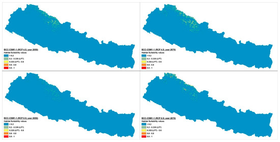 The current potential distribution predicted by the Maxent model is shown in Figure 2. Grid cells with habitat suitability values for D. hatagirea below the lowest presence threshold (LPT = 0.335) are unsuitable areas (blue and green colors). Under current climate conditions, the potentially suitable habitats are located in the districts Darchula, Bhajang, Dolpa, Magdi, Mustang, Manang, Kaski, Gorkha, Rasuwa, Sindhupalchok, Dolakha, Sholukhumbu, and Sankhuwasabha in Nepal. That is, there is an area of 10,839 km2 with a suitability index larger than 0.2 (Figure 2). In Kunwar et al. [59], some additional areas, covering 25,479 km2, are reported as being suitable: Bajung, Kalikot, Humla, Mugu, Jumla, Rukum, and Taplejung. Under future climate scenarios (Figure 3, Figure 4 and Figure 5), it is expected that suitable habitats will only remain in Dolpa region. However, the suitable areas will then include the districts Mugu and Humla (Figure 3, Figure 4 and Figure 5) and the total range of very highly suitable areas covers c. 1700 grid cells under RCP4.5 in 2070 under the BCC-CSM1-1 model (Figure 3). All of the suitable habitats (both current and new) will be collapsed in the HadGEMM2-ES model (Figure 6).