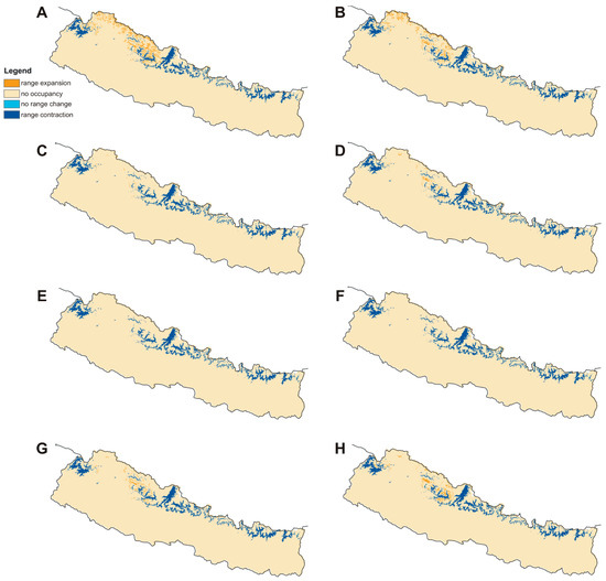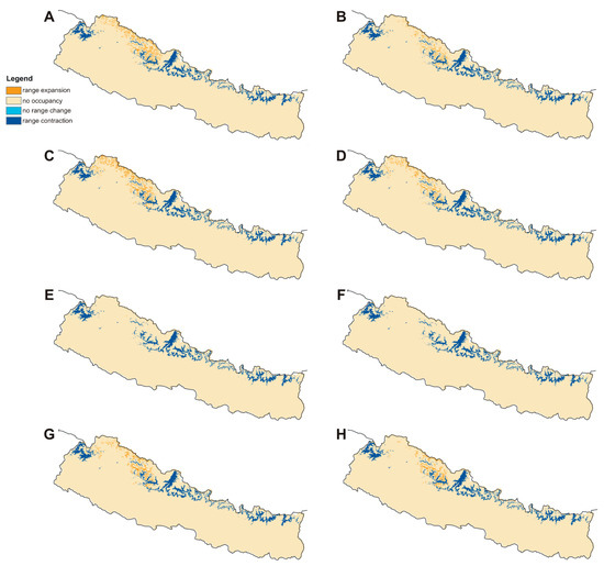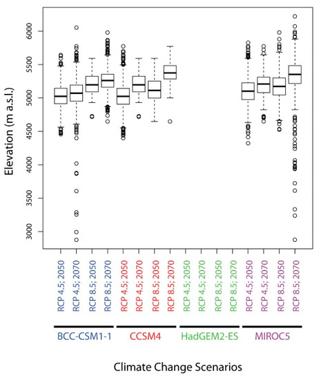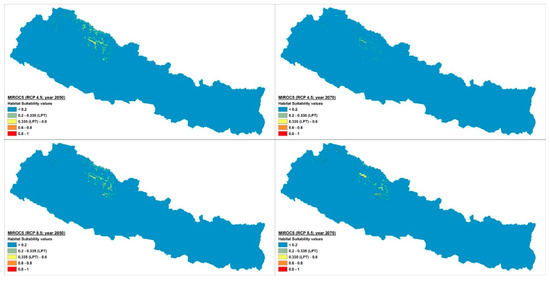 The future potential distribution of D. hatagirea and its habitat suitability in Nepal was predicted using 16 climate change scenarios, corresponding to the years 2050 (average for 2041–2060) and 2070 (average for 2061–2080). Specifically, for each period (2050 and 2070), four climate change models were chosen under the fifth Coupled Model Intercomparison Project (CMIP5). We chose the following climate change models: (a) the Hadley Earth System Model (HadGEM2-ES), (b) the Community Change System Model (CCSM4), (c) the Beijing Climate Centre Climate System Model (BCC-CSM1-1), and (d) the Model for Interdisciplinary Research on Climate (MIROC5). Two Representative Concentration Pathways (RCPs) were used for each period and each climate change model. The four different pathways that are available differ in the amounts of greenhouse gases that are expected to be emitted in the future. Beginning from the RCP2.6 to the RCP8.5, the emissions increase and thus RCP2.6 is a low emission scenario, whereas the RCP8.5 is a maximum emission scenario. The other two emission scenarios (RCP4.5 and RCP6.0) fall between these two extremes. In our analyses, we used the maximum greenhouse gas emission scenario (RCP8.5) and one out of the two medium greenhouse gas emission scenarios. Following Jiang et al. [94], and their results for China, the RCP4.5 was preferred instead of the other medium gas emission scenario (RCP6.0).