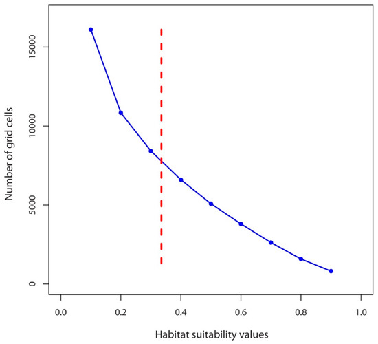 The outcome of the species distribution models is a continuous suitability map, which is usually converted into presence/absence data [76]. In the present study, the lowest presence threshold (equaling the minimum training presence) was used because it provides a reliable distribution of the studied species and can be better interpreted ecologically [95].