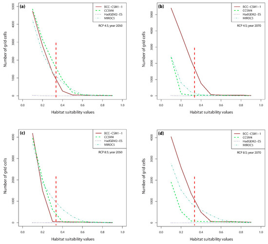 Under current climatic conditions, the habitat suitability values of 7731 grid cells were above the lowest presence threshold (LPT = 0.335) (Figure 7), whereas under the future climate scenarios, the number of grid cells with potentially suitable habitats falls dramatically, reaching a maximum of ca. 1700 grid cells in 2070 under BCC-CSM1-1 (RCP4.5) scenario (Figure 3 and Figure 8b). Contrary to other climate change models, the Hadley Earth System Model (HadGEM2-ES) predicts the collapse of almost all suitable habitats under all four types of climate change scenarios (Figure 6 and Figure 8).