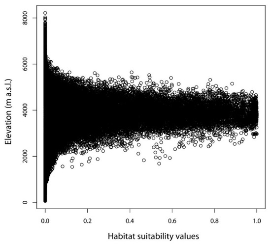 Under the current climatic conditions, the potentially suitable areas for D. hatagirea are located between 2300 and 5000 m. a.s.l., whereas the average altitude is at ca. 4000 m (Figure 11). Under future climate change scenarios, it is expected that D. hatagirea will shift towards higher altitudes, reaching up to 6000 m a.s.l., whereas the average altitude will be ca. 5000 m (Figure 12).
