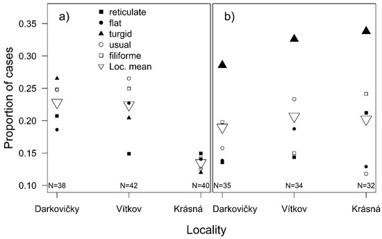 Proportion of cases when beetles chose a particular morphotype (reticulate, flat, turgid, usual, filiforme) of moss sampled from individual localities (Loc. mean = mean proportion of cases when beetles chose the mosses sampled from the locality), when the mosses had (a) preserved spatial structures or (b) removed spatial structures. The differences in proportion of cases when beetles chose a morphotype from individual localities were tested by generalized estimating equation models with binomial distribution. “N” denotes the number of beetles encountering a morphotype from a given locality.