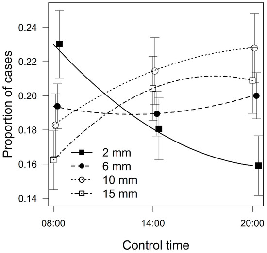 Proportion of cases when beetles chose mosses with preserved spatial structures with varying of the maximal free space among the stems (flat = 2 mm, reticulate = 6 mm, filiforme = 6 mm, usual = 10 mm, turgid = 15 mm) during the daytime (mean ± standard error, the trends are based on loess). The differences in proportion of cases when beetles chose a moss with given space among stems were tested by generalized estimating equation models with binomial distribution.