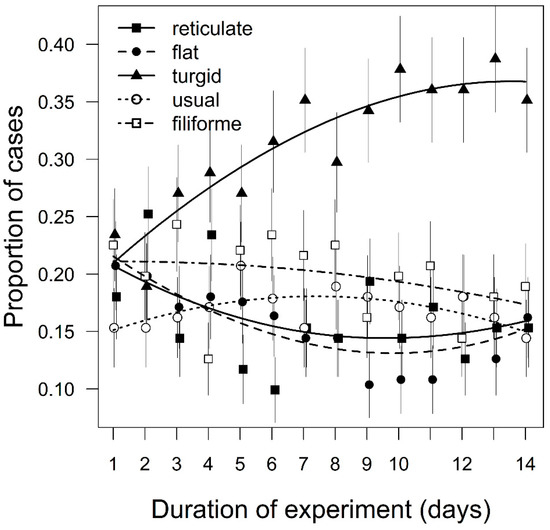 Proportion of the cases when beetles chose moss morphotypes (reticulate, flat, turgid, usual, filiforme) with removed spatial structures on each day of the experiment (mean ± standard error, the trends are based on loess). The differences in proportion of cases when beetles chose a particular morphotype were tested by generalized estimating equation models with binomial distribution.