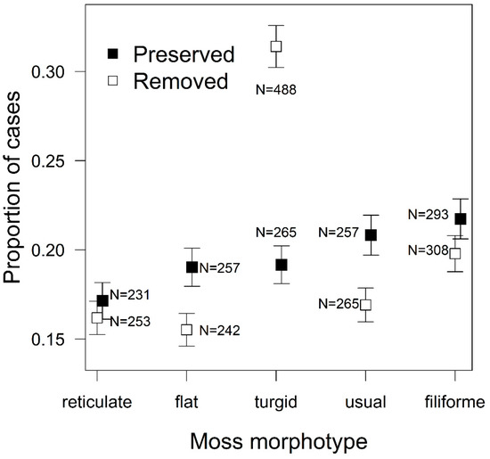 Proportion of cases when beetles chose the different moss morphotypes when the mosses had “preserved” or “removed” spatial structures (mean ± standard error). The differences in proportion of cases when beetles chose a particular morphotype were tested by generalized estimating equation models with binomial distribution. “N” denotes the number of positive cases when beetles chose a particular morphotype.