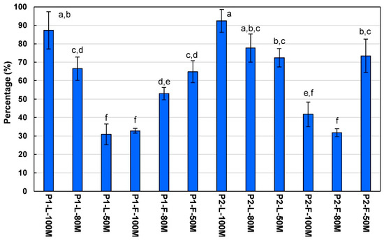 Average percentage of total flavonoid content from the total phenolic content of methanolic extracts from Verbesina sphaerocephala leaves and flowers. Bar plot represents mean ± standard deviation of three repetitions. Different letters indicate significant differences between groups within homogeneous subsets (Tukey, p < 0.05). Abbreviations: P1, Population 1; P2, Population 2; L, leaves; F, flowers; 100M, extracted with 100% methanol; 80M, extracted with 80% methanol; 50M, extracted with 50% methanol.