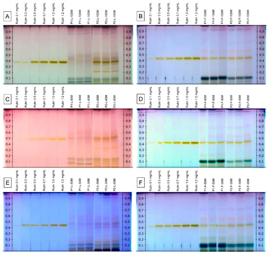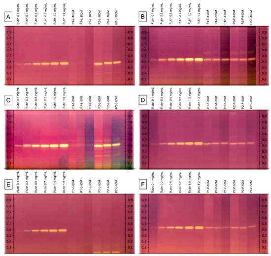 HPTLC fingerprint analysis of V. sphaerocephala extracts was, for the first time, performed in the present work. As observed in Table 1, the highest content of rutin was found in the extract P2-L-80M, extracted from leaves of Population 2 with 80% methanol (13.97 ± 4.09 mg/g DT), which was about 11 times higher than the extract with the lowest content (P1-L-100M, 1.21 ± 0.22 mg/g). Overall, extracts from Population 2 showed a rutin content superior to the rest (p < 0.05). The concentrations of rutin of the 100%, 80%, and 50% methanolic extracts from V. sphaerocephala leaves and flowers are presented in Table 1. The rutin content in the extracts from V. sphaerocephala showed a tendency, since the highest rutin contents were observed in samples that obtained the highest total phenolic and flavonoid contents. According to the analysis, a positive correlation was observed between the total phenolic and flavonoid contents and the rutin content (R = 0.689, p < 0.01 and R = 0.563, p < 0.01, respectively) of the V. sphaerocephala extracts.