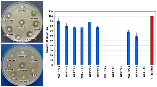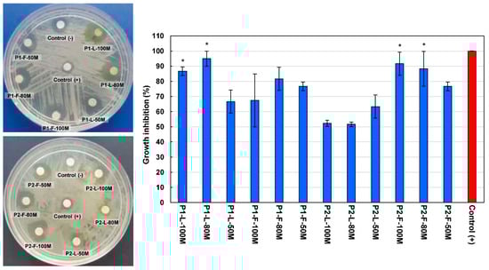 All extracts showed growth inhibition against E. coli, ranging from 51.67 to 95.00%. As can be observed in Figure 4, the best results of bacterial growth inhibition against E. coli were obtained by the leaf extract from Population 1 extracted with 80% methanol (P1-L-80M), reaching 95.00 ± 5.00% (19 mm) > the flower extract from Population 2 extracted with 100% methanol (P2-F-100M), with 91.67 ± 7.64% (18 mm) > the flower extract from Population 2 extracted with 80% methanol (P2-F-80M), with 88.33 ± 11.50% (17.6 mm) > the leaf extract from Population 1 extracted with 100% methanol (P1-L-100M), with 86.67 ± 2.89% (17 mm). According to Dunnett’s test, no significant difference was found in the bacterial growth inhibition of the extracts mentioned above and the control used (ampicillin, 10 mg/mL).