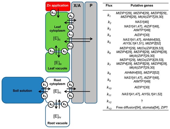 Suggested model for roles of putative genes encoding proteins involved in Zn transport- related processes. The sites of action in the plant (i.e., root cytoplasm, rc; root vacuole, rv; xylem and apoplast, X/A; phloem, P; leaf cytoplasm, lc; leaf vacuole, lv) and the element (E) fluxes (K1–13) are reported. The concentration of the element is indicated in each site [E]. The scheme synthetizes information across studies in various plants. Gene abbreviations: ZIP, Zrt-/Irt-like protein; NAS, nicotianamine synthase; ZIF, zinc-induced facilitator; MTP, metal transporter protein; HMA, P1B-type heavy metal ATPase; YSL, yellow stripe like protein; ZIP? indicates a generic ZIP; free diffusion: diffusion through leaf epidermis; stomata: absorption through stomata. Plant abbreviations: Mt, Medicago truncatula; At, Arabidopsis thaliana; Os, Oryza sativa. References: [,,,,,,,,,,,].
