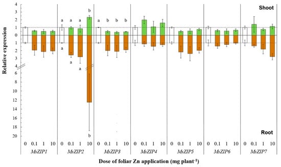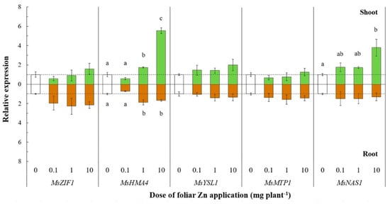 In roots, all ZIP genes except MsZIP2 were not significantly affected by foliar Zn application, although a general trend of MsZIP1, MsZIP3, MsZIP5, and MsZIP7 towards upregulation with increasing foliar Zn doses was observed. Of the other genes related to Zn transport processes, the expression of MsHMA4 was significantly upregulated in both shoots (F(3, 11) = 115.29, p < 0.01) and roots (F(3, 11) = 14.23, p < 0.01) following the application of 1 and 10 mg Zn plant−1 (shoots: +63% and +424%, respectively; roots: +86% and +66%, respectively; Figure 4).