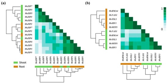 Heatmaps reporting correlations between expression of genes related to Zn transport after foliar Zn application. Gene expression is calculated as the difference between 0.1, 1, or 10 mg Zn plant−1 and a control of 0 mg Zn plant−1. The similarity in the degree of correlation in fold-change of gene expression to Zn application relative to the control was based on the average linkage clustering of the Pearson correlations (r). In the clustering trees, the genes are indicated in brown for roots and in green for shoots, while the ranks of correlations of the heatmap are indicated by color intensity (r 0 to 1: from low to strong intensity of green). Seven genes encoding transmembrane Zn transporter (MsZIP1-7) (a); four genes encoding cellular Zn transporters (including vacuolar transporters) (MsZIF1, MsHMA4, MsYSL1, and MsMTP1) and a gene encoding a nicotianamine synthase (MsNAS1) (b).