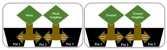 - Treated neighbor (TN): Without contact with the MeJa solution, with its root also separated into two parts, where half was in pot 2, allowing direct contact with the roots of the treated group, while the second half was in pot 3.