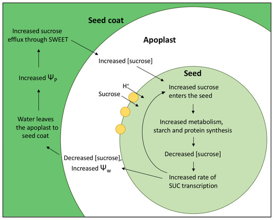 Densities of SUCs and proton pumps are regulated within sink tissues themselves. Increasing sucrose import into seeds leads to an increased metabolism of both C and N within seeds, resulting in a positive feedback loop which maintains continued uptake of both. When sucrose concentrations decrease within the sink, sugar sensing mechanisms detect this drop and a signaling cascade results in increased SUC transcription [50] (Figure 1). With more SUCs comes an increase in C uptake into the seed, which lowers the sucrose concentration in the apoplast and increases water potential. This leads to a loss of water from the apoplast to surrounding tissues, the seed coat in bean, increasing turgor pressure within the seed coat. Increased turgor upregulates sucrose facilitators, which allow sucrose release from maternal tissues into apoplast [49,51]. Therefore, more C enters the apoplast and can be taken up into the seed, leading to the increases of C and N metabolism again. Increased phloem and seed loading of nitrogen in the form of amino acids results in increased SUC concentrations as well as root nitrate transporters [52], showing nitrogen and carbon metabolisms are highly linked. Additionally, import of carbohydrate is increased via upregulation of starch biosynthesis, which fits with the sugar sensing feedback loop described above [43]. Conversely, increased sucrose concentration correlates highly with decreases SUT1 expression [50].