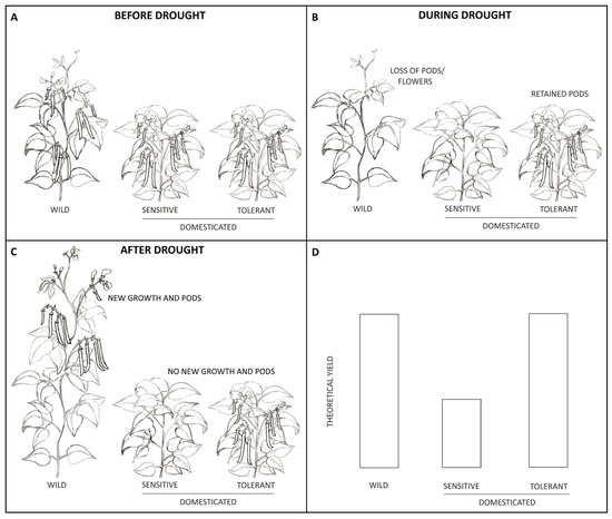 Effects of drought on flowers, pods, and yield in wild and domesticated common bean. (A) shows reproductive development in wild, vine beans compared to domesticated bush beans. Both have flowered and are producing pods. In (B), drought has caused both the wild and drought-sensitive domesticated lines to abort flowers and pods, however, the drought-tolerant line has retained its pods. All flowers and pods have been removed from these plants to accentuate drought’s affect, however, many times not all flowers and pods aborted under drought. (C) shows the wild line re-initiating both vegetative and reproductive growth once the drought has passed, allowing it to set new flowers and pods while the domesticated drought-sensitive line is unable to do the same. Theoretical differences in yields under drought (D) show that both the wild and drought-tolerant line are able to achieve a higher yield than the drought-sensitive line.