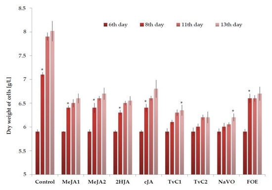 Changes in dry weight of control and elicited grapevine cells during cultivation in vitro on the 6th, 8th, 11th, and 13th day of cultivation (*—statistical significance, p ≤ 0.05).