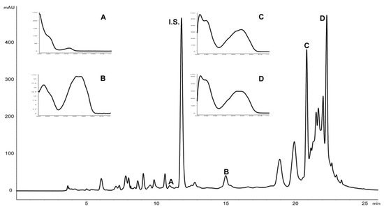 HPLC analysis of extracts from grapevine cell cultures on the 13th day of cultivation, that is, 7 days after treatment with TvC2. A—trans-piceid, B—trans-resveratrol, C—ε-viniferin, D—δ-viniferin, I.S.—internal standard (ferulic acid).