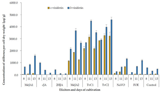 The δ-viniferin is a resveratrol dehydrodimer and an isomer of the ε-viniferin. This compound has been reported as a molecule produced in vitro by the oxidative dimerization of resveratrol by plant peroxidases or fungal laccases and was identified in grapevine cell cultures as well as in wines [54]. The effects of all used elicitors on the production of δ-viniferin and ε-viniferin during cultivation are presented in Figure 4. The production of these two stilbenes increased from the time of addition of the elicitor to the 13th day of elicitation in most of the elicitors used. The opposite occurred when cells were treated with cJA and 2HJA. Elicitations by NaVO and especially by FOE not affected synthesis of both viniferins as effectively as elicited trans-resveratrol and trans-piceid. Both the cJA and 2HJA have been proven as not effective in the elicitation of δ-and ε-viniferin.